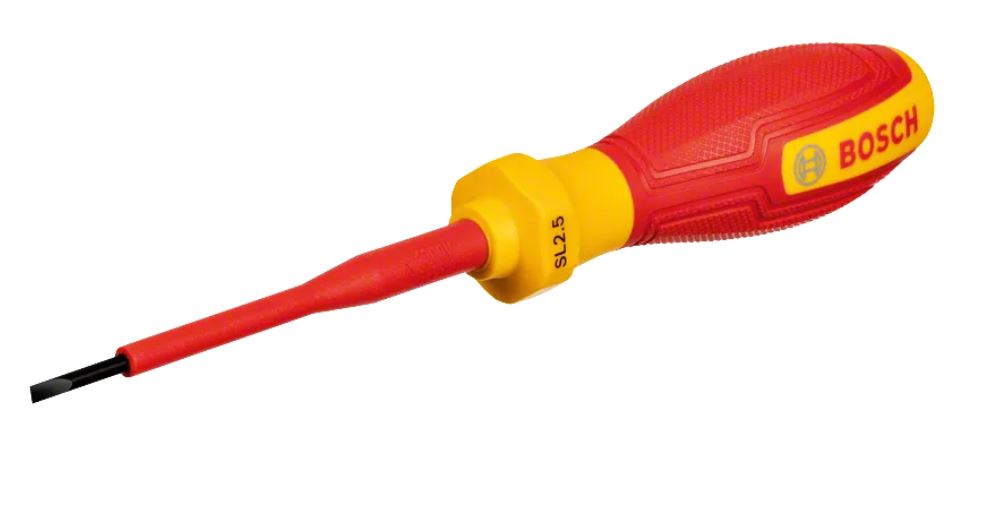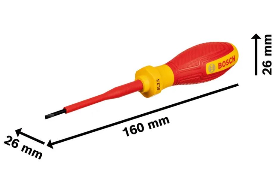 | Bosch VDE odvijač SL2.5x75 Professional 1 600 A02 NC0 | Profil SL Promjer ručke  26 mm Duljina osovine 75 mm Promjer lista 2,5 mm Izvedba materijala S2 VDE Ergonomska ručka Pronalazač alata Ručka s mekanim rukohvatom Dizajn sa zaštitom od prevrtanja Standardna izolacija noža Maksimalni napon 1.000 V Težina 0,029 kg  |