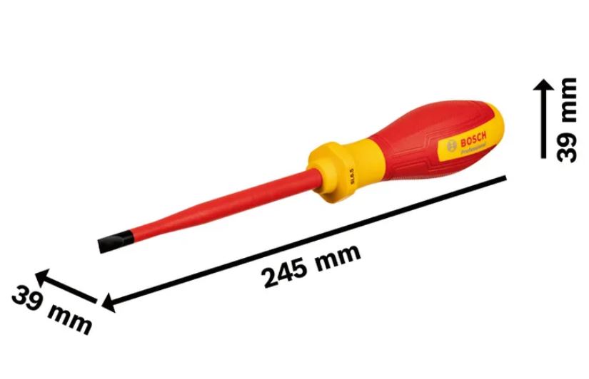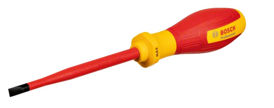 | Osnovni podaci | Profil SL Promjer ručke 38 mm Širina noža 6,5 mm Duljina osovine 125 mm Promjer lista 6,5 mm Debljina noža 1,2 mm Izvedba materijala S2 VDE Ergonomska ručka Pronalazač alataRučka s mekanim rukohvatomDizajn sa zaštitom od prevrtanjaTanka izolacija noža Maksimalni napon 1.000 V Težina 0,115 kg |