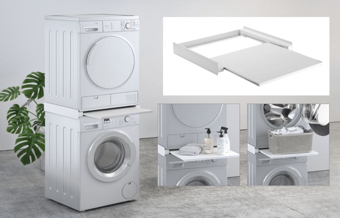Kompatibilan sa svim standardnim ili tankim perlicama i sušilicama rublja sa prednjim punjenjem,širine 60 cm,maksimalne dubine 60 cm. Brzo i jednostavno instaliranje,sigurnosni remen od 6 metara uključen u pakiranje,maksimalna nosivost police 60 kilograma. Polica omogućava uštedu prostora postavljanjem sušilice na perilicu rublja te nije potrebna nikakva montaža.