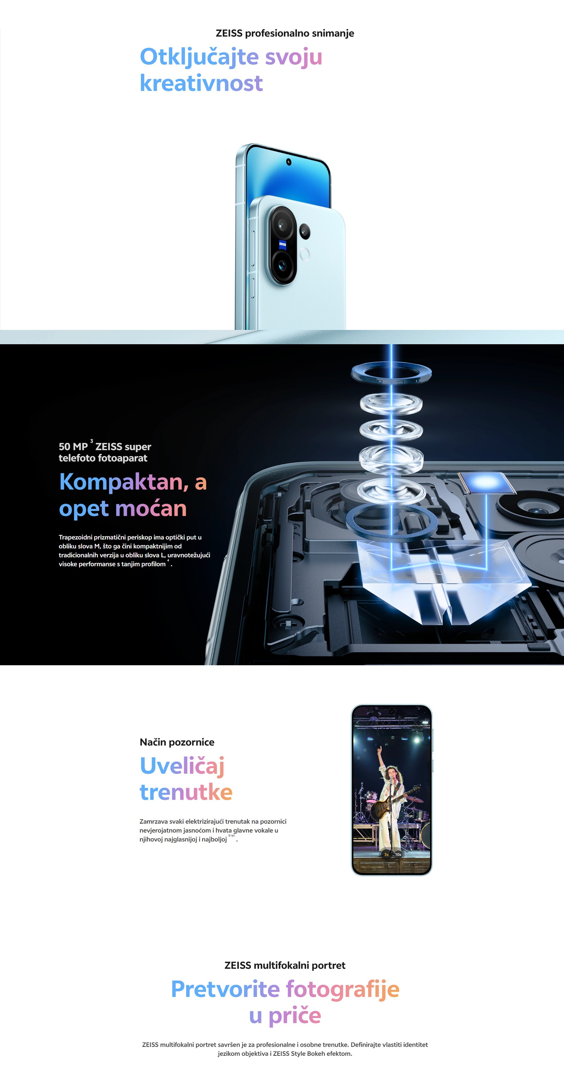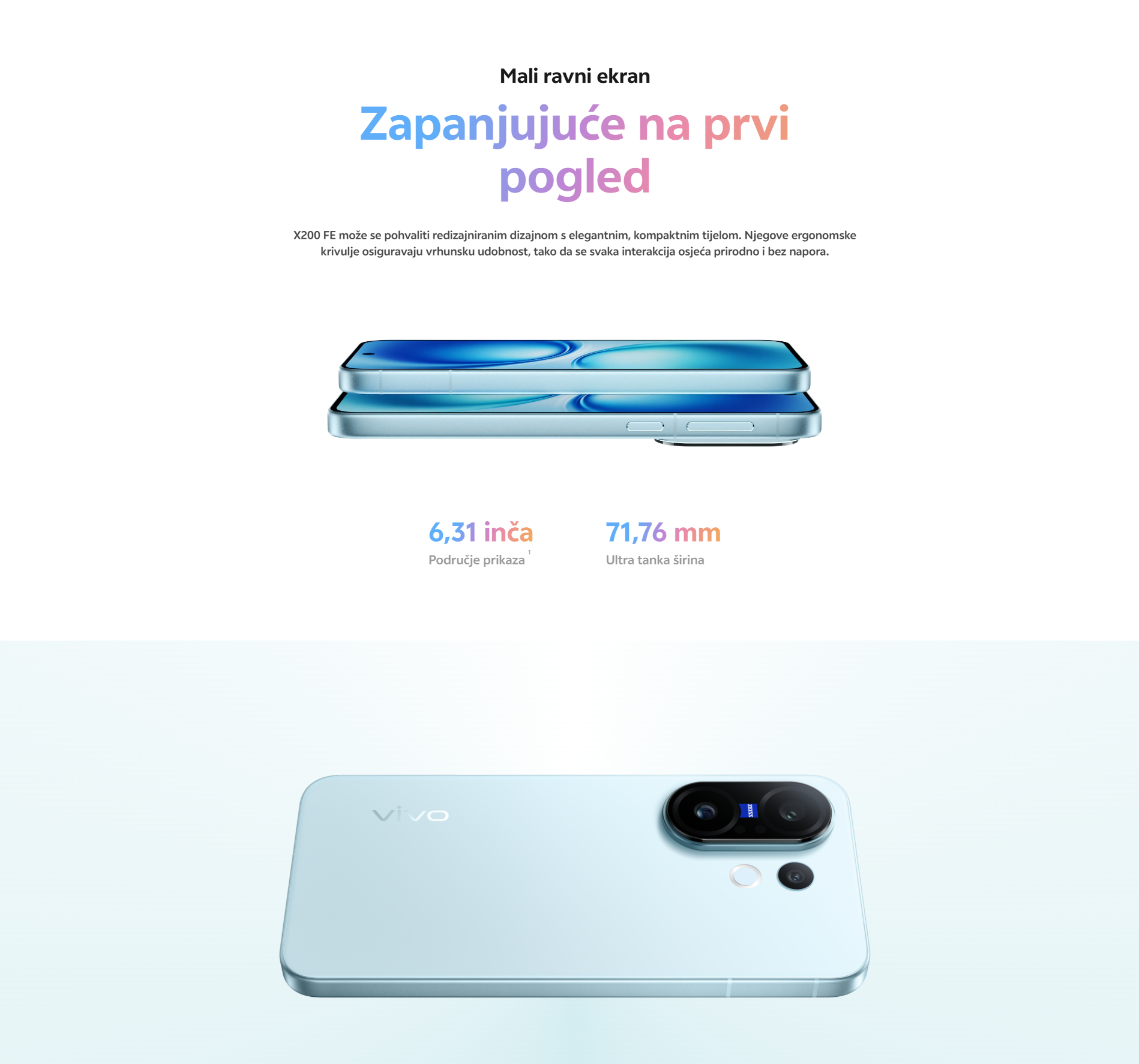 Vivo X200 FE ima impresivan sustav kamera razvijen u suradnji sa ZEISS-om: Glavna stražnja kamera 50 MP, Periskopska telefoto kamera 50 MP, ultraširokokutna kamera 8 MP, te prednja kamera 50 MP.
