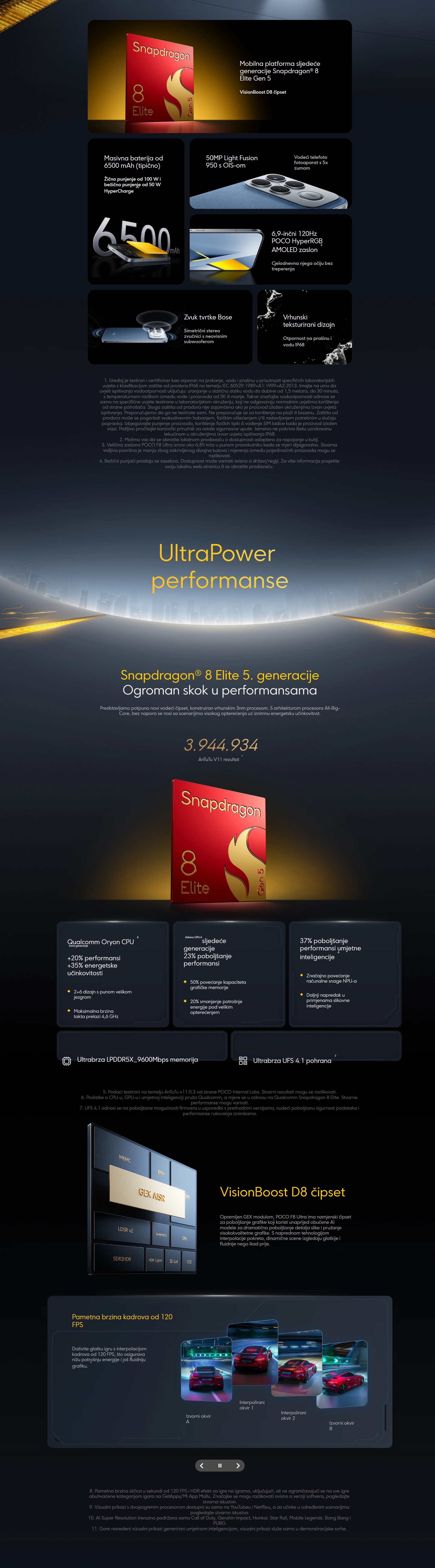 | Zaslon | 6,9" AMOLED zaslon Rezolucija: 2608 x 1200 Frekvencija osvježavanja: do 120Hz Pro HDR zaslon Wet Touch zaslon 2.0 HDR10+, Dolby Vision® TÜV certifikat za smanjenje plavog svjetla (hardversko rješenje) TÜV certifikat za uklanjanje treperenja TÜV certifikat za cirkadijalnu prihvatljivost Frekvencija uzorkovanja dodira: Do 480Hz, Brzina uzorkovanja trenutnog dodira: Do 2560Hz Zaštita zaslona Poco Shield Glass |